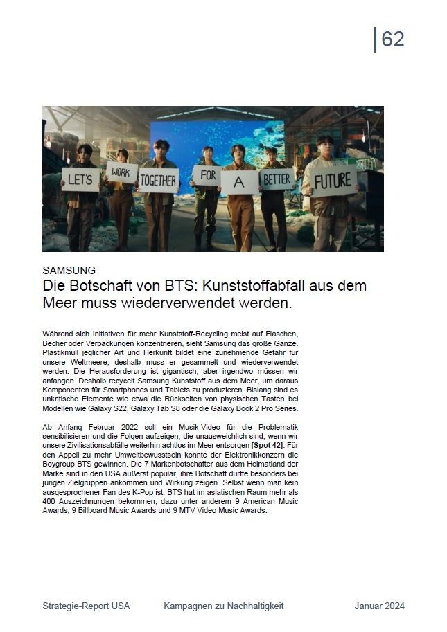 - Kunststoff-Recycling: Samsung hat mit der südkoreanischen Boygroup BTS eine Hommage an ein ikonisches Video von Bob Dylan gedreht. Die Botschaft: "Let's work together for a better future". Den Anfang macht die Wiederverwendung von Kunststoffabfall aus dem Meer.