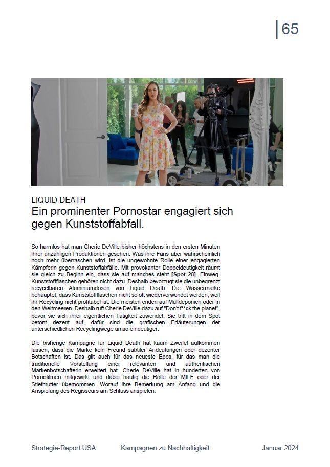 - Plastikmüll: SodaStream will Kunststoff-Flaschen vermeiden und setzt dabei auf prominente Unterstützung von Snoop Dogg und David Hasselhoff. Adidas hilft bereits angefallenen Plastikmüll zu beseitigen und Kia steuert eine umstrittene Idee zur bequemen Reinigung der Strände bei. Auch ein bekannter Pornostar vermeidet Kunststoff-Flaschen.